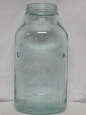 rare Horlick's malted milk blue glass jar sign 1 gallon canister tin dairy can