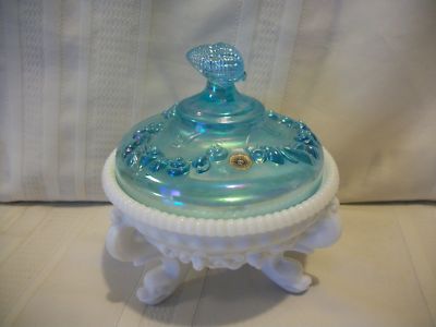 WESTMORELAND Argonaut Shell & Dolphin Covered Dish - Milk Glass & Iridescent