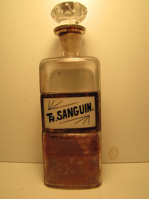 Title (ebay affiliate link): LABEL UNDER GLASS APOTHECARY PHARMACY BOTTLE - TR. SANGUIN. - F & S ST LOUIS MO