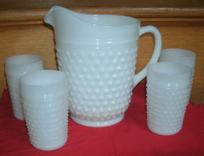 WHITE MILK GLASS HOBNAIL PITCHER AND JUICE GLASSES 5 pcs.