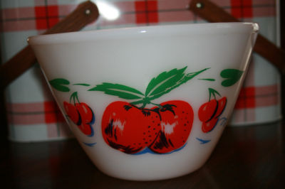 VINTAGE FIRE-KING RED APPLE CHERRY KITCHEN MIXING BOWL MILK GLASS WHITE