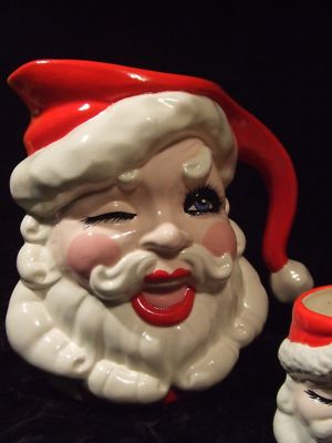 Title (ebay affiliate link): Vintage 1940's Santa Claus Ceramic Pottery Pitcher w/ 3 Mugs Christmas