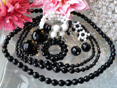 Title (ebay affiliate link): ELEGANT BLACK & MILK GLASS JEWELRY LOT FAB COIL BRACELET 30" NECKLACE W GERMANY+