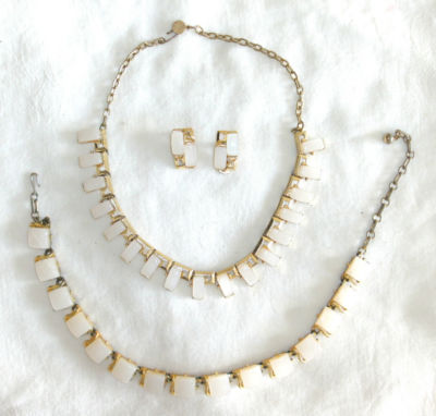 Title (ebay affiliate link): Pair Goldtone Necklaces w/ Pearlized Milk Glass Stones & 1 Pair Earrings