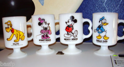Title (ebay affiliate link): Mickey & Minnie Mouse Donald Duck & Pluto milk glass footed coffee cup mug