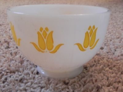 Title (ebay affiliate link): Vintage Anchor HOcking Fire King Yellow Flower Design Bowl White milk Glass 3"