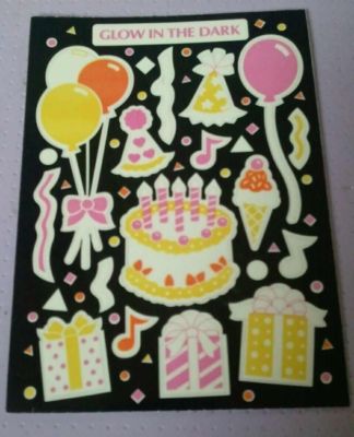Title (ebay affiliate link): RARE VINTAGE 80'S 1983 SANDYLION GLOW IN DARK "BIRTHDAY PARTY" STICKERS