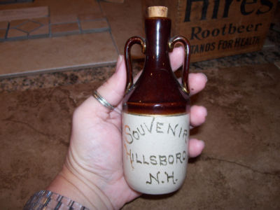 ANTIQUE MINIATURE STONEWARE CROCK JUG, SOUVENIR OF HILLSBORO, NEW HAMPSHIRE,2HD