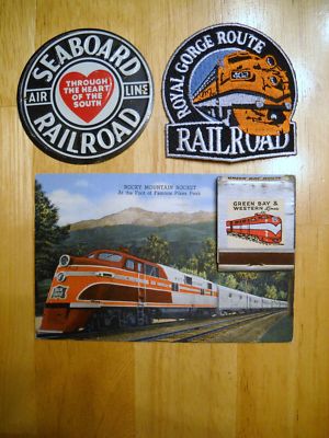 VINTAGE RAILROAD ITEMS!!! PATCH, MATCHBOOK, TIN SIGN, & POSTCARD!!! NICE nr