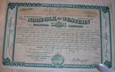 Title (ebay affiliate link): 1885 NY STOCK CERTIFICATE: Norfolk and Western Railroad Co. with shillings STAMP