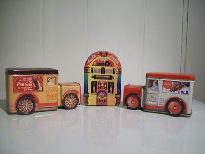 Title (ebay affiliate link): Lot of 3 coca-cola tins (1 jukebox, and 2 delivery trucks)