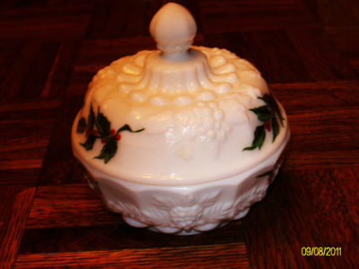 Title (ebay affiliate link): NICE OLD WESTMORELAND MILK GLASS LIDDED CANDY DISH WITH PAINTED HOLLY AROUND IT