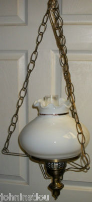 Title (ebay affiliate link): VINTAGE ELECTRIC HURRICANE MILK GLASS GWTW HANGING LAMP -- Gold Banded