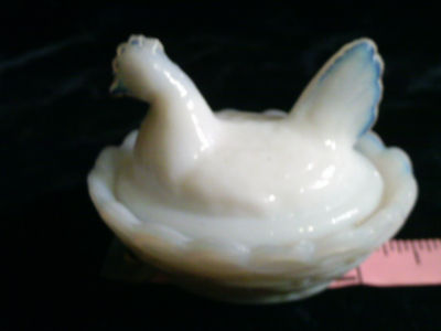 Title (ebay affiliate link): VTG ESTATE TINY WHITE MILK GLASS CHICKEN / HEN COVERED SALT DISH EVC