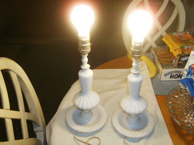 Title (ebay affiliate link): PAIR OF VINTAGE WHTE MILKGLASS SWIRL BEDROOM TABLE LAMPS W/ SHADES WORKING COND.
