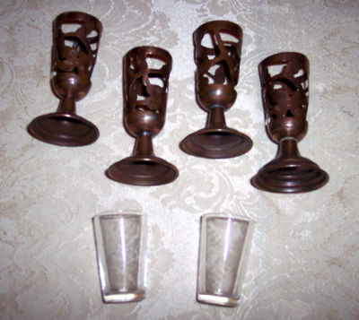 Title (ebay affiliate link): SET 4 ANTIQUE, ORNATE, COPPER FOOTED CORDIAL STEMS with GLASS INSERTS - VERY OLD