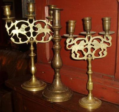 Title (ebay affiliate link): Neoclassical BRASS CANDELABRA 11.5" Lion Shield Tri Candlestick shabbat judaica