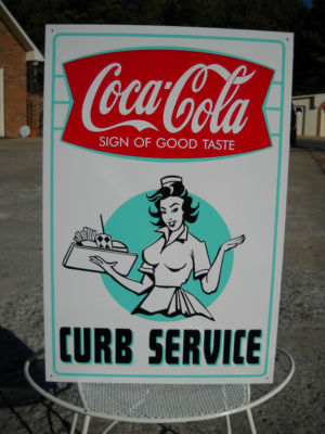 Title (ebay affiliate link): Coca-Cola Curb Service 50's Diner Soda Shop With Car Hop Girl Metal Sign w/NR