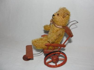Title (ebay affiliate link): Tiny Antique Mohair Teddy Bear - Wooden Cart (Souvenir of Coney Island)