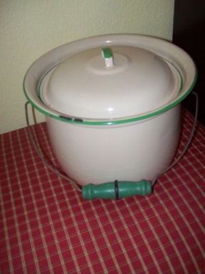 Title (ebay affiliate link): vintage awesome green & beige enamel pot with lid/primitive country decor usable