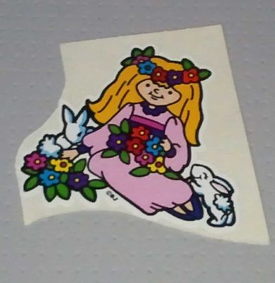 Title (ebay affiliate link): RARE VINTAGE 70'S BJ BLONDE FLOWER GIRL W/ BUNNIES 2" VINYL STICKER