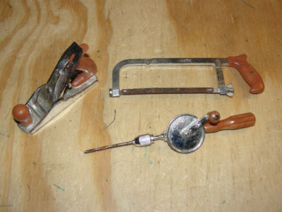 Title (ebay affiliate link): Vintage Marx Toy Tools Wood Plane Hand Drill Hacksaw 1950s 3" to 5"