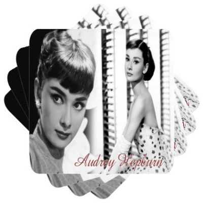 Title (ebay affiliate link): New Audrey Hepburn Set of 4 Square Rubber Drink Coasters