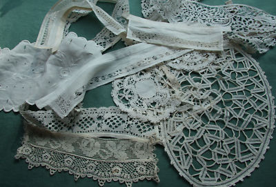 Title (ebay affiliate link): ANTIQUE COTTON LACE LOT FOR PROJECTS WHITEWORK DRAWNWORK DOLL CUFFS COLLARS