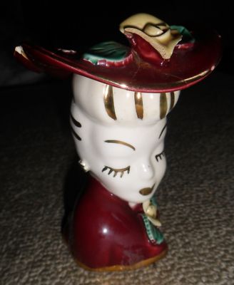 Title (ebay affiliate link): Ceramic head vase of beautiful woman in burgundy hat and dress