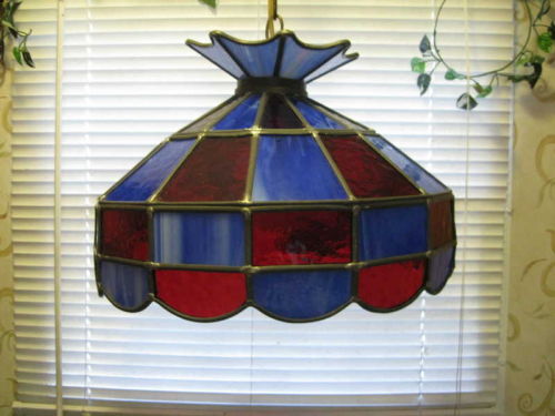 Title (ebay affiliate link): Mid Century Hanging Stained Glass Overhead Swag Lamp, Rare Ruby Red Deep Blue