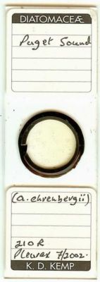 Title (ebay affiliate link): Arachnoidiscus Diatoms from Puget Sound Microscope Slide by K. D. Kemp