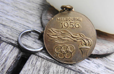 Title (ebay affiliate link): Vintage OLYMPIC logo Torch Melbourne 1956 Marathon AD KeyChain Medallion Charm