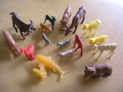 Title (ebay affiliate link): 16 really old Vintage Plastic Farm Animals Bear Fish Pigs Dogs +more