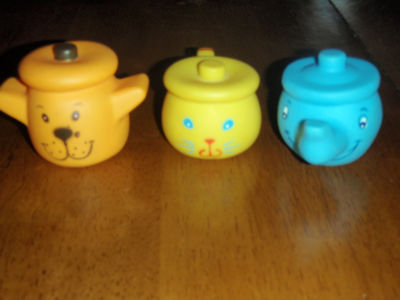 HTF Vintage The First Years Squeak toys pot and pan Avon Rare animal face