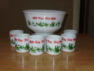Title (ebay affiliate link): Vintage Milk Glass Egg Nog Punch Bowl w/6 Cups / Mugs Hazel Atlas Green / Red