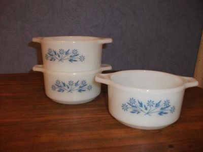 Title (ebay affiliate link): Vtg. 3 Dynaware Casserole Dishes with blue flowers on milk glass-mint condition