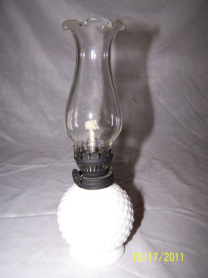 Title (ebay affiliate link): "VINTAGE" SOLID WHITE "MILK-GLASS" "HOBNAIL" OIL LAMP w/CLEAR GLASS CHIMNEY