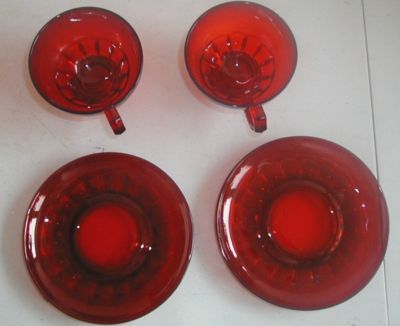 Title (ebay affiliate link): 2 VINTAGE DEPRESSION RUBY RED CUP AND SAUCER PAIR