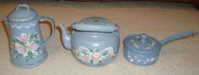 METAL TEA SET - KETTLE, POT AND PAN - VERY PRETTY FLORAL