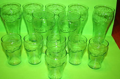 Title (ebay affiliate link): 13 Pebble Green Coke/Coca-Cola Drinking Glasses, Large & Small