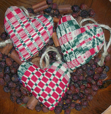 Title (ebay affiliate link): Primitive Vintage Woven Red Green & Ecru Coverlet Tuck Mini Hearts Set 3 Ornies