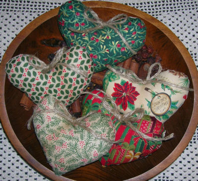 Title (ebay affiliate link): Primitive CHRISTMAS HEART Ornies TUCKS Holiday Bowl Fillers Set 5 Festive Hearts