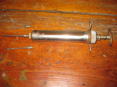 Title (ebay affiliate link): Antique Irrigation Syringe with 3 Needles. Glass with nickel plating