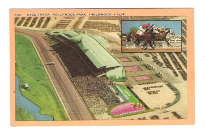 Title (ebay affiliate link): Inglewood, Ca/ Race Track in Hollywood Park/ horses & riders/old linen postcard