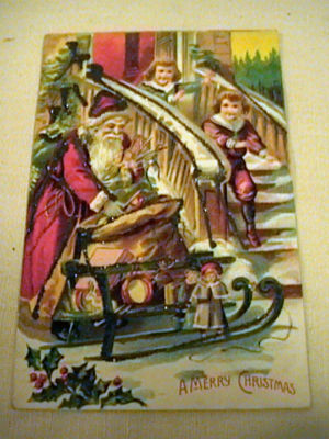 Title (ebay affiliate link): OLD CHRISTMAS POSTCARD CHILDREN RUN TO SANTA SLEIGH TOYS
