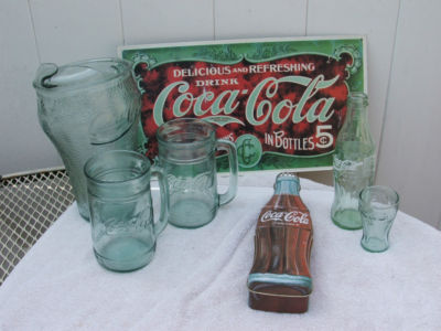Title (ebay affiliate link): Coca Cola green mugs, pitcher, mini glass, bottle, tin & sign.Coke glass
