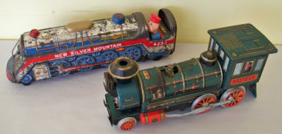 Title (ebay affiliate link): 2 1950s ANTIQUE TIN TRAINS NEW SILVER MOUNTAIN WESTERN TRAIN ENGINES TIN BATTERY