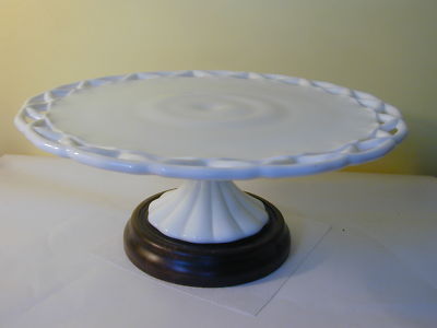 14" CAKE STAND ANTIQUE MILK GLASS WOOD BASE VINTAGE