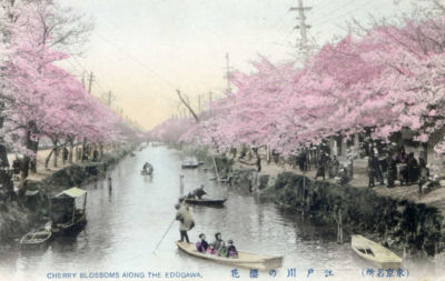 1900s postcard Cherry Blossoms along the Edogawa Japan