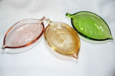 Title (ebay affiliate link): PINK MARIGOLD IRIDESCENT GREEN DEPRESSION GLASS LEAF DISHES JAM PLATES